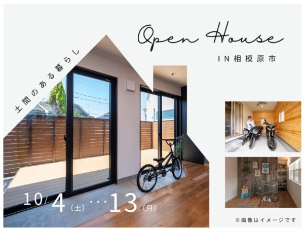 相陽建設(SOLE LIVING)の完成見学会「趣味も遊びも暮らしも広がる。土間があるから叶う暮らし」は、まさにその体験を凝縮。10/4(土)〜10/13(月)10:00–16:00、相模原市中央区田名で開催します(火・水定休/無料駐車場あり)。