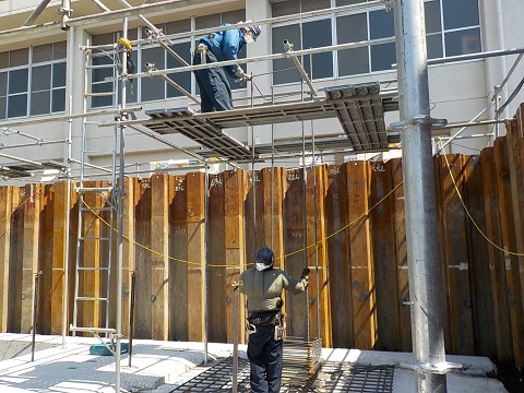 未分類 地足場 2018年8月2日 コメントはまだありません 横浜市 校舎新築工事の現場では写真で撮ったように、 一番低い基礎を施工する場所に 地足場組を作成する作業が完了しました。 地足場とは、 基礎工事の際に運搬等の使用のため、 根切で掘った底から足場を立てて、現場敷地の高さに沿って 足場の通路等を作成するモノになります。 この足場材を利用して先ずは鉄筋組み作業を実施していく訳です。 Continue Reading
