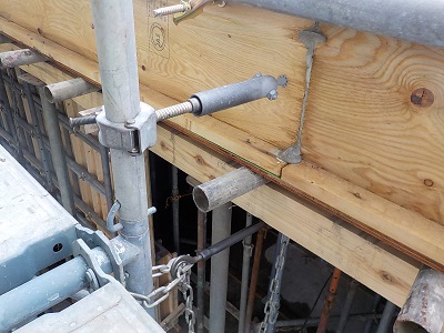 基礎ピット内に作業員が入って型枠解体作業を実施するので、
