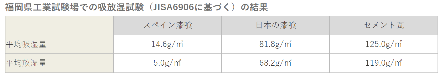 冬場は壁層が湿気を蓄えて蓄熱し、室内の暖かさを持続します。この様に壁面に透湿効果があることにより、四季を通じて湿度がコントロールされ、一年を通じ快適な室内空間を実現します。下記はスペイン漆喰の吸湿放散能力の試験データです。