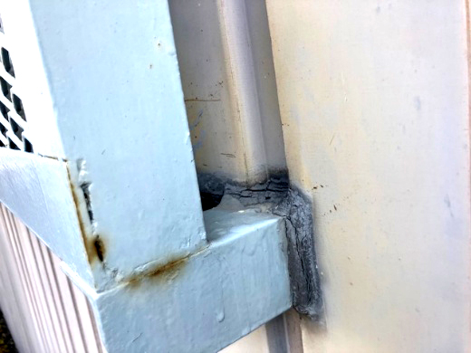 サッシ廻りの防水材にひび割れがありました。内部も漏水の形跡が見受けられますのでシーリングの打替えをお勧めします。