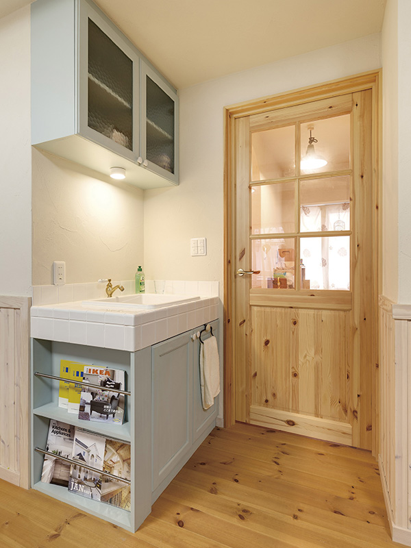 こだわりの洗面は、シンクとタイル部分のみを白くし本体は奥様のイメージに合わせて水色に仕上げました。