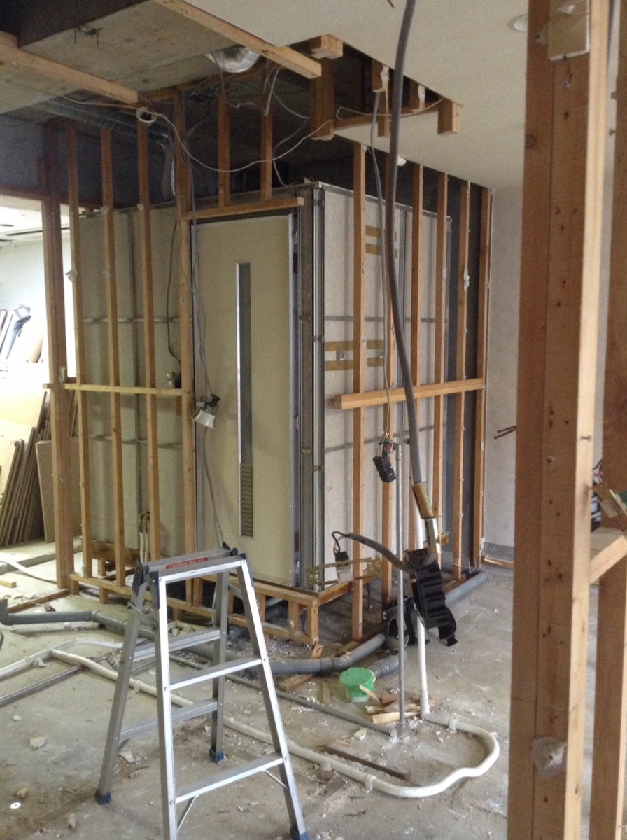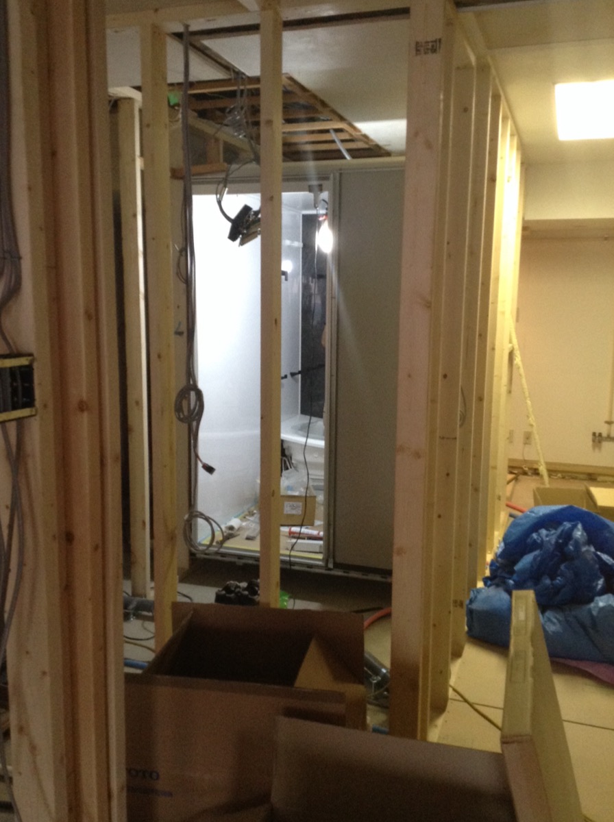ユニットバス側の壁が居室に面しているので、遮音の為のグラスウールを充填し、遮音シートを張り施工しました。